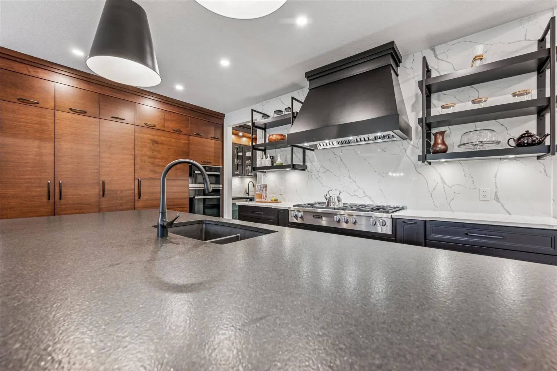 At its heart is an award-winning backyard retreat by Silverfern, featuring bespoke landscaping and exquisite stonework that frames a custom-designed pool. The outdoor space is a seamless extension of the home’s luxury, offering a private resort atmosphere ideal for entertaining or quiet relaxation.