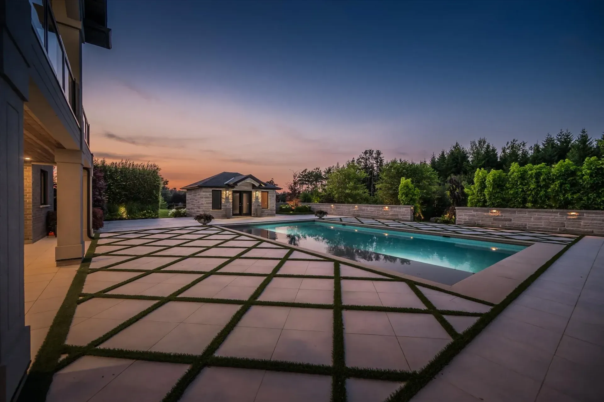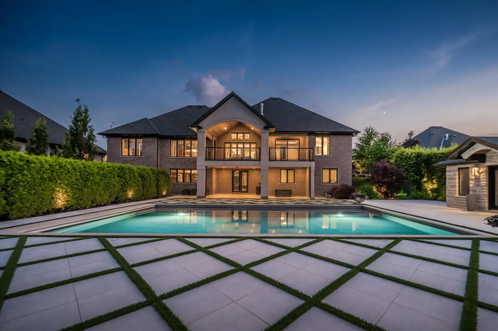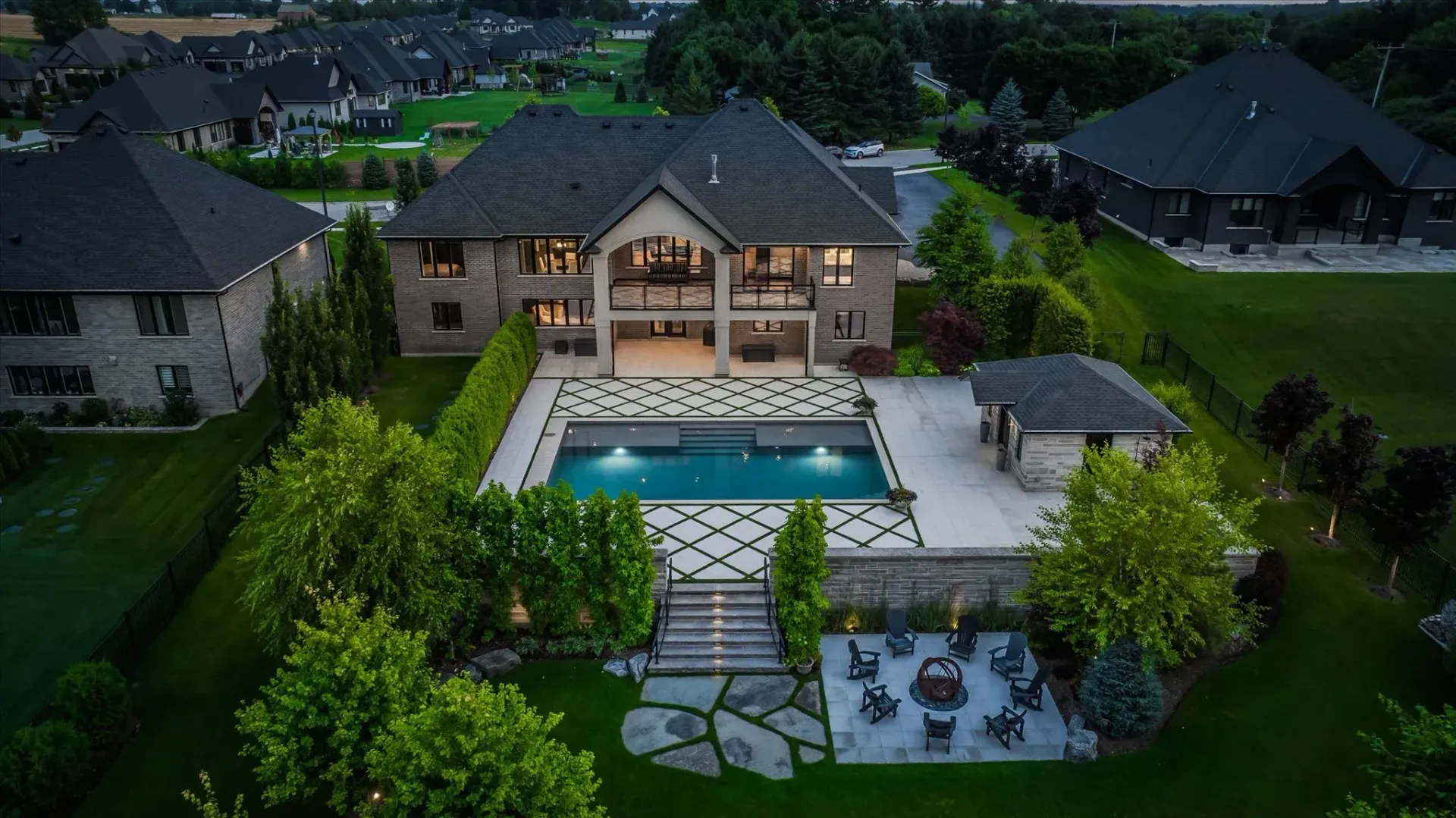 A custom year-round pool, ambient lighting, and award-winning landscaping create a private retreat, complete with a cedar-lined pool house and built-in fire pit.