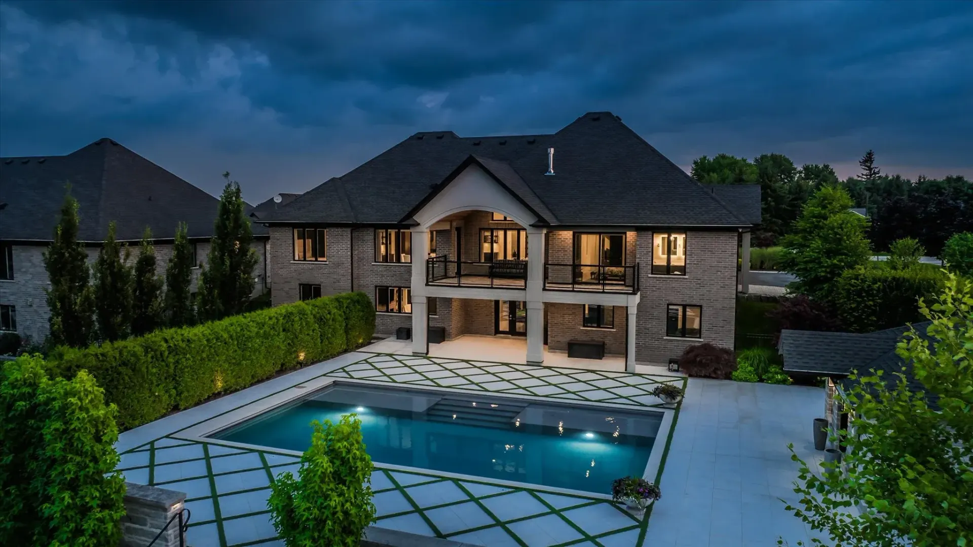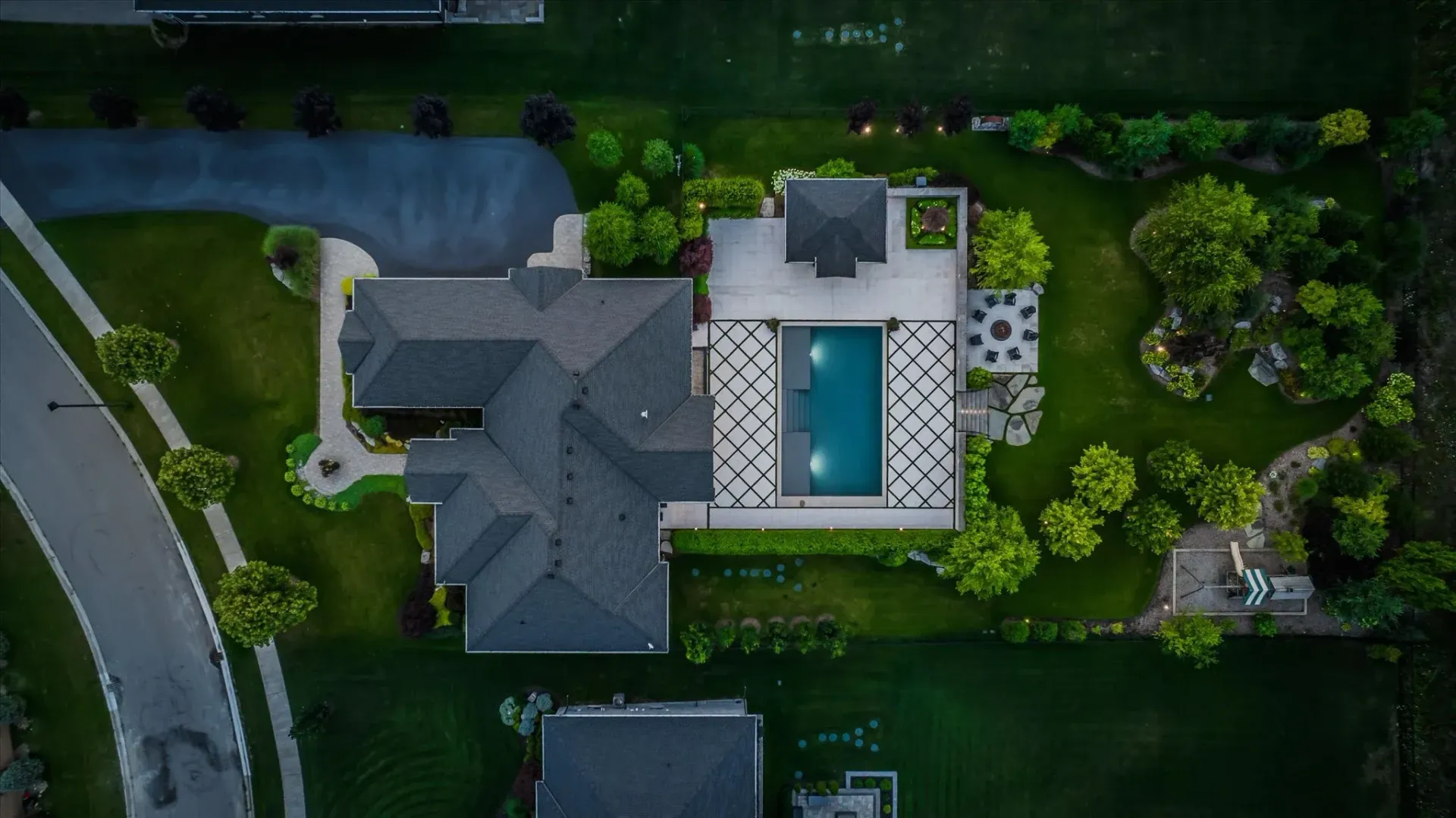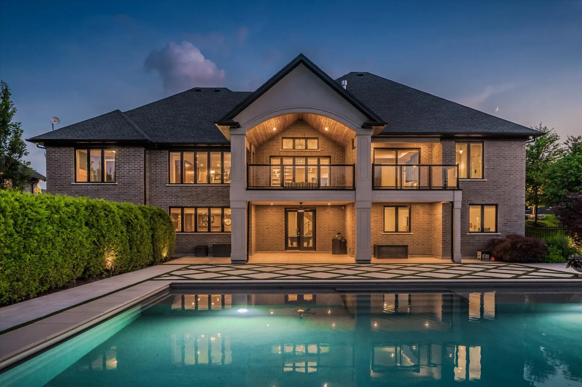 A custom year-round pool, ambient lighting, and award-winning landscaping create a private retreat, complete with a cedar-lined pool house and built-in fire pit.