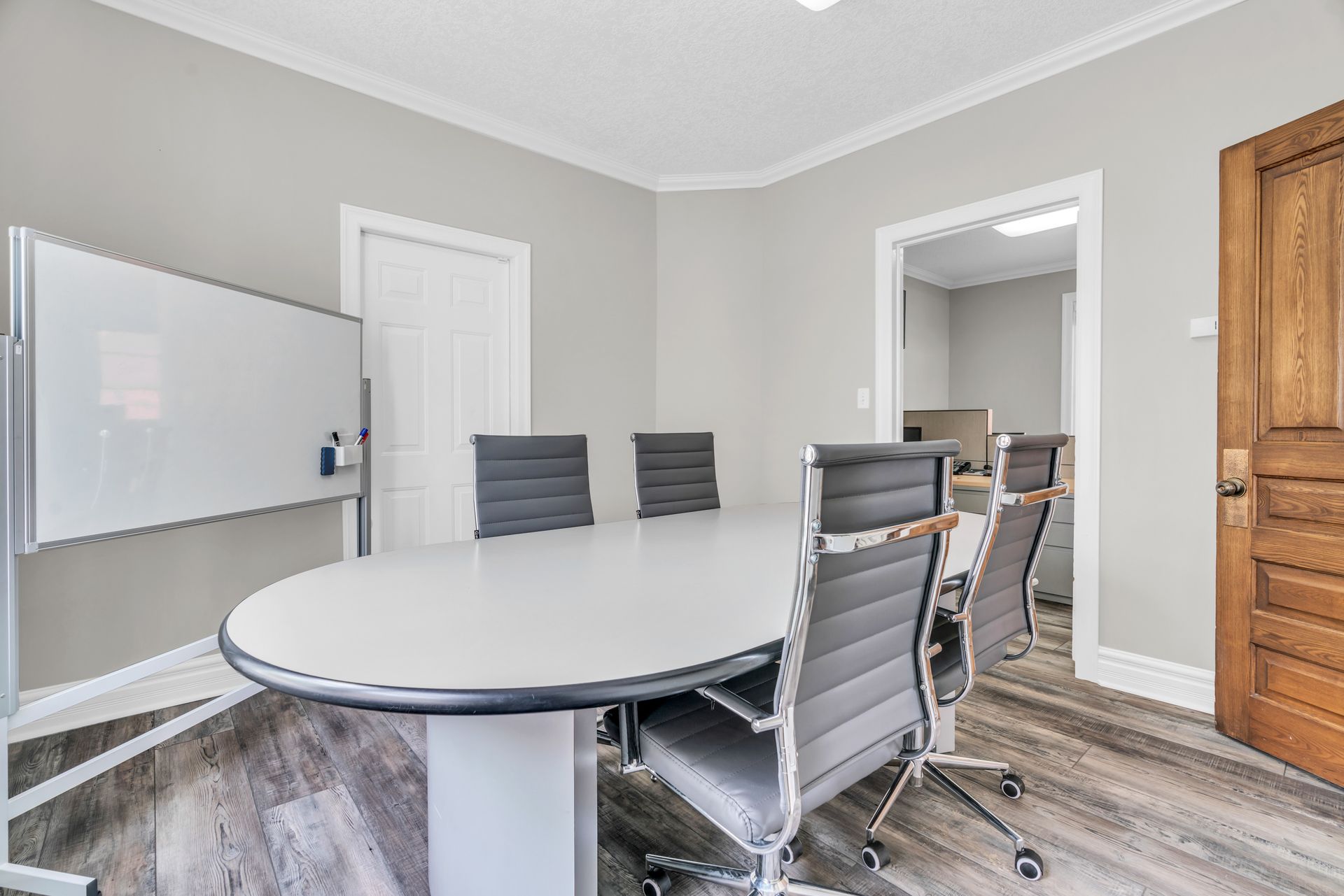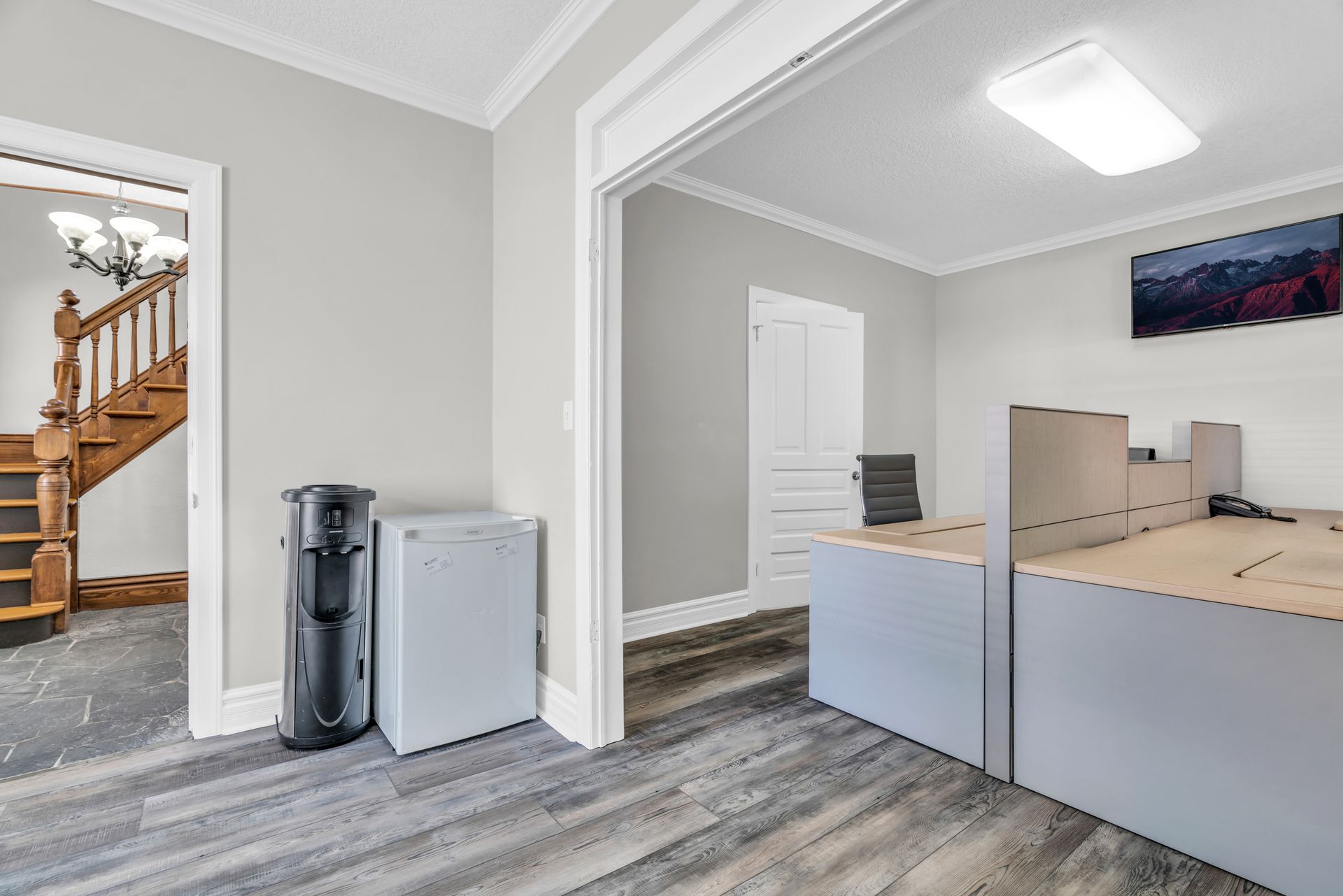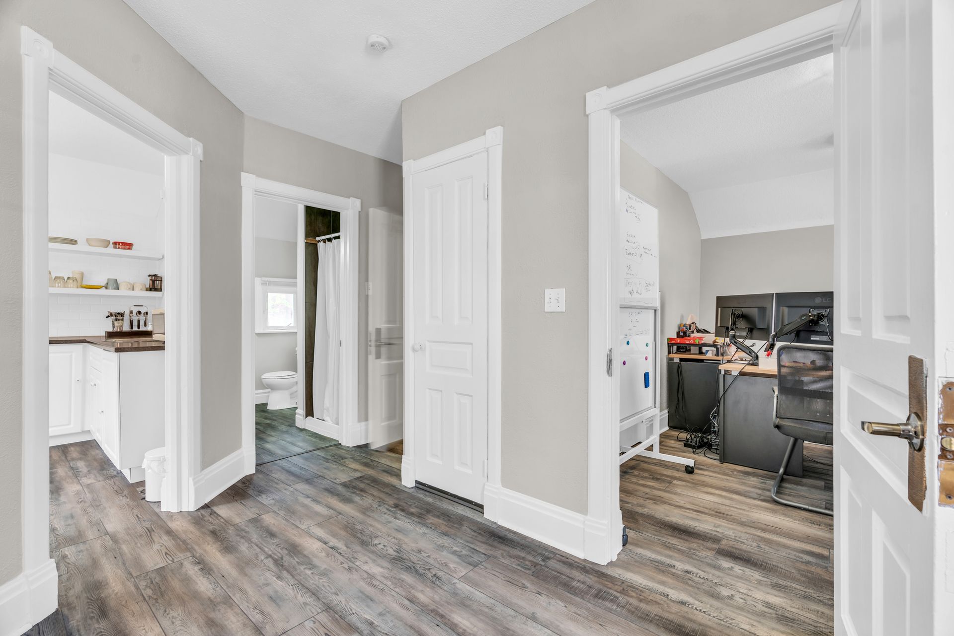 2 level home with 4 separate offices, including board rooms, reception/lobby area, outdoor balcony, full kitchenette and walk-up attic for additional storage.